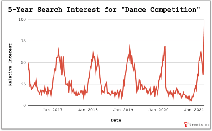 The Signal: Searches for “dance competition” have quadrupled in recent months. These businesses, which were some of the first to be disrupted by COVID-19, sustained heavy losses in 2020. Now demand is higher than it has been in years.