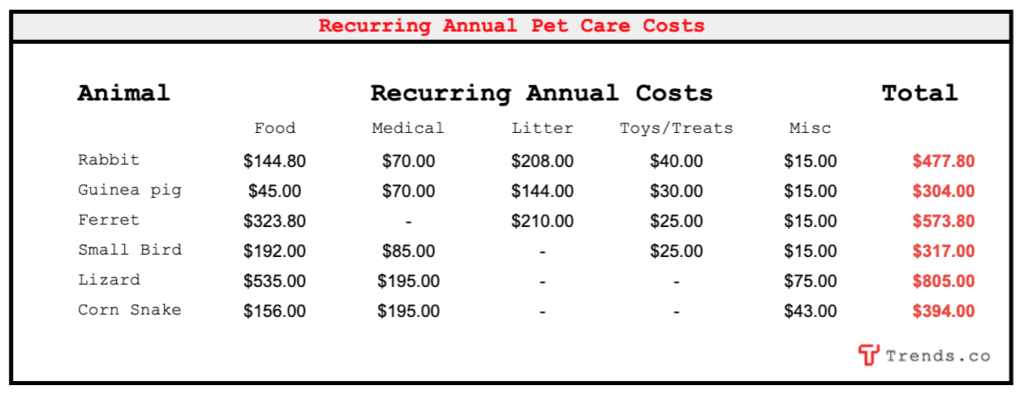 Health Care: Pet medication is an ~$8.6B industry in the US, and vet care is still one of the highest costs associated with pet ownership. It ranges from 15% of annual costs for rabbits to as much as 50% in the case of corn snakes.